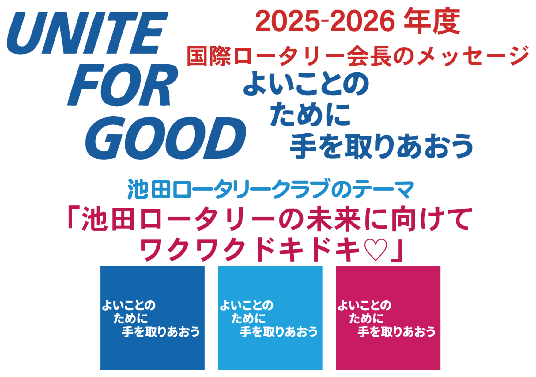 また、RI会長のメッセージ「よいことのために手を取りあおう」とてもシンプルですが私は心から共感し、世界中の人々の笑顔を想像できるメッツセージと受け止め、我々池田ロータリークラブのテーマーを「池田ロータリーの未来に向けてワクワクドキドキ」と定め、先ずは我々池田ロータリーの仲間を増やし「よいことのために手をとりあい」その仲間たちと地域活動に励み、更なるワクワクドキドキ笑顔溢れる社会を創生してまいりたいと考えております。